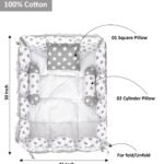 This soft and breathable cotton baby bed set gives your little one ultimate comfort. Designed for newborns and toddlers (0-1 year), this 30×22-inch rectangle bed comes with 2 rolling pillows, 1 rectangle-shaped pillow. Its reversible design allows for dual-sided use, making it stylish and durable.